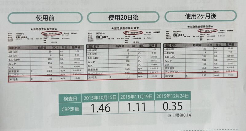 もちろん、11個もあった他の異常数値が7個に。2カ月で4個に。CRPも